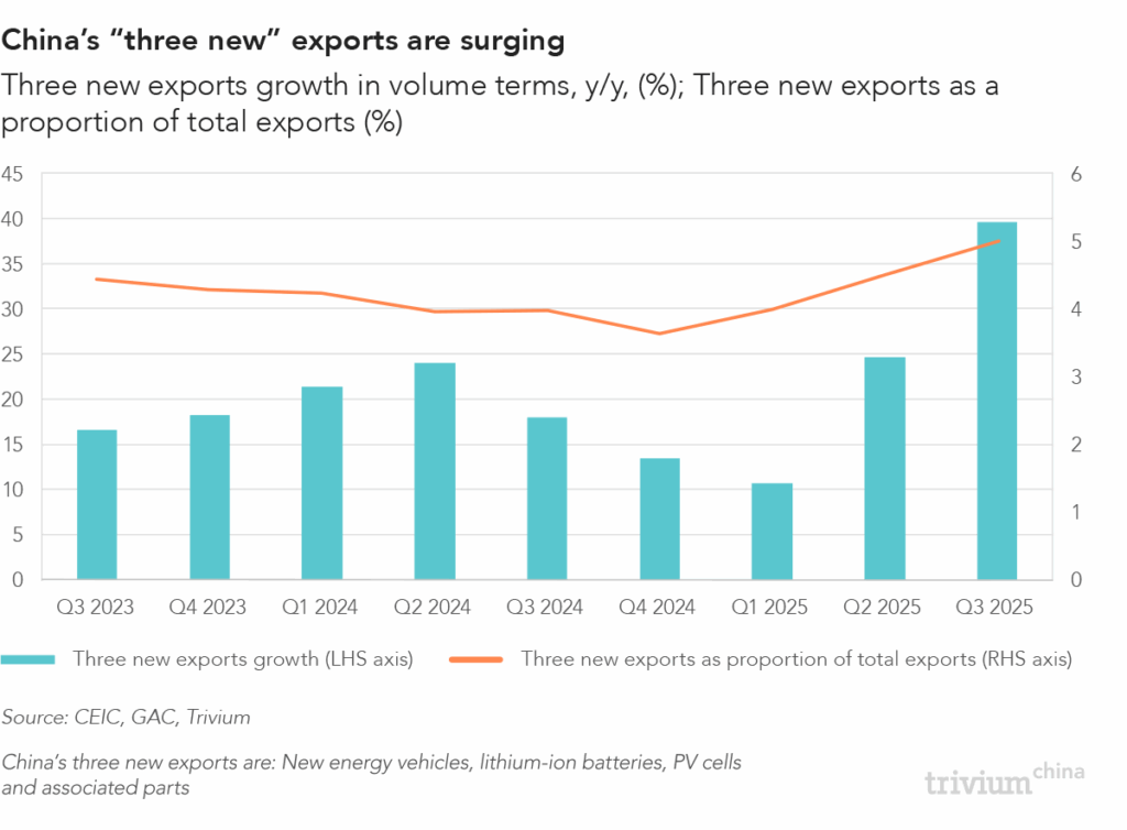 - Across Q3, the aggregate export value of new energy vehicles (NEVs), lithium-ion batteries, and PV cells – China’s so-called “three new” exports – surged 33.4% y/y.