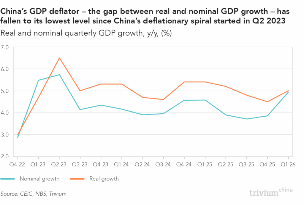 Get smarter: The narrowing gap between real and nominal growth suggests China is edging out of its deflationary spiral – but the Iran war complicates that reading.