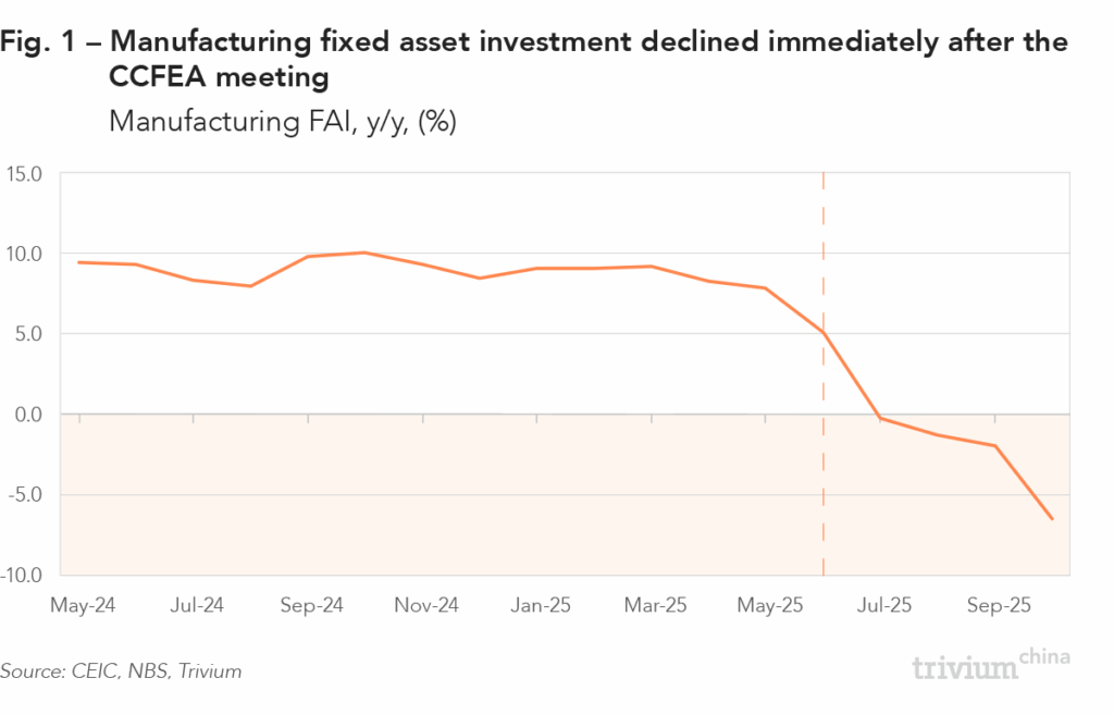 After an impressive 59 months of consecutive growth, manufacturing investment slipped into the red in July and has continued to decline – at an accelerating pace – ever since.Much of this pullback reflects Beijing’s campaign against overcapacity [Fig. 1]. In early July, the Central Commission for Financial and Economic Affairs (CCFEA) – the Party’s top economic policymaking body – pledged to crack down on the “involution-style” competition plaguing China’s economy, from petrochemicals to electric vehicles (NEVs), and cleantech to metals. The CCFEA said it would rein in price wars, improve product quality, and support the “orderly exit” of outdated capacity. Later that month, the Politburo reaffirmed these policies at its monthly meeting.