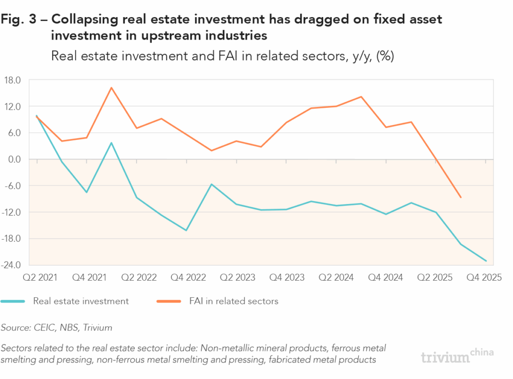 The property sector is also closely intertwined with upstream industries supplying raw and processed construction materials. As developers scale back construction, demand for materials like steel, glass, bricks, and cement drops, leading manufacturers in these sectors to pull back on FAI [Fig. 3].