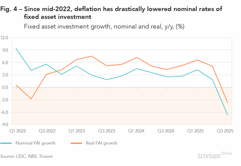First, part of this gap reflects deflation: Producer prices fell 2.9% in Q3, so while the nominal value of FAI fell 6.6%, in real terms it only declined 3.7% [Fig. 4].